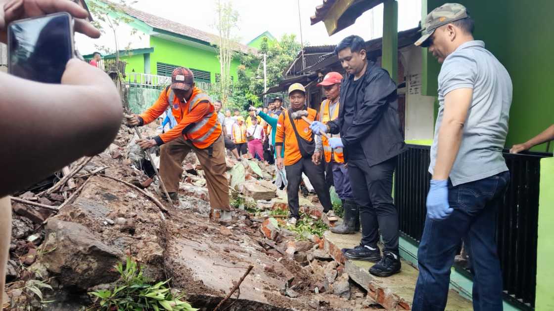 “Semalam kami sudah lakukan pengecekan setelah menerima laporan dari warga dan tim lapangan. Dinding pembatas SD dengan pemukiman warga ini memang roboh karena hujan dengan intensitas tinggi,” ujar H. Bambang di sela-sela kegiatan gotong royong, Minggu (20/4/2025).